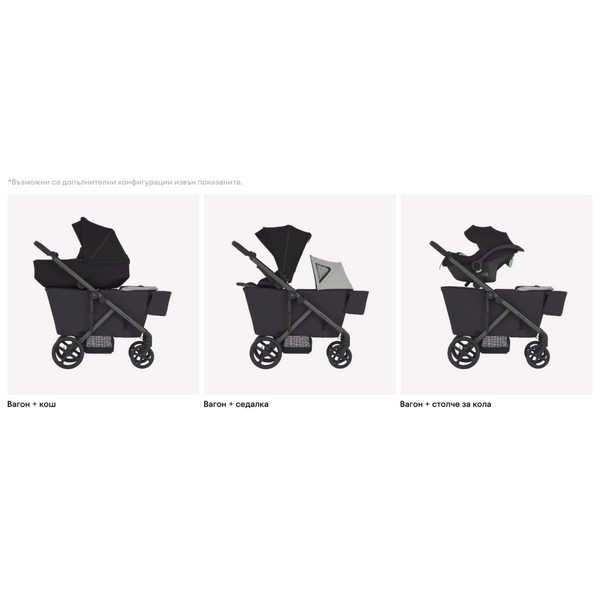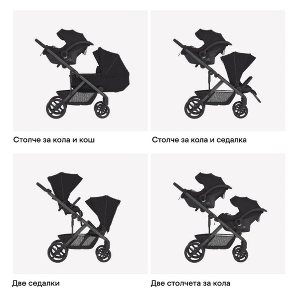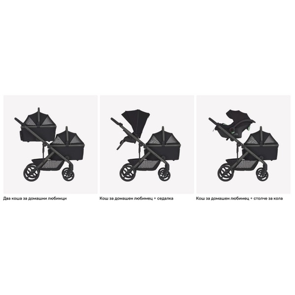 Позволява множество варианти — като двойни кошове, двойни седалки за близнаци, или смесени конфигурации с столче за кола, кош за домашен любимец или вагон.