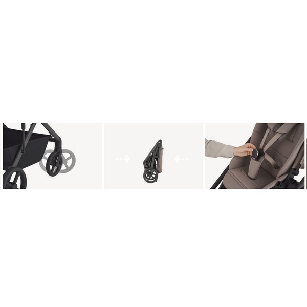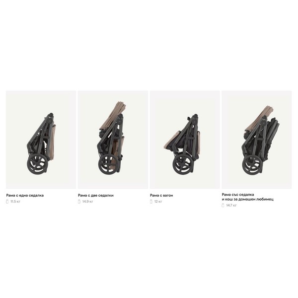 Компактно сгъване във всички конфигурации - сгъва се компактно и остава самостоятелна във всички конфигурации, дори включително две седалки или режим количка, независимо от посоката или позицията на седалката.