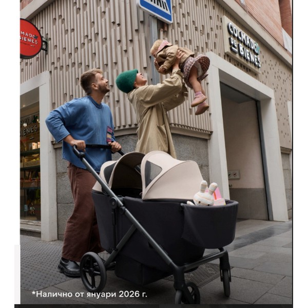 Просторна и гъвкава конфигурация за две деца (от 6 месеца до 4 години или до 22 кг всяко). Включва допълнително място за крака, опционална масичка и подвижни сенници — перфектна за активни малчугани.