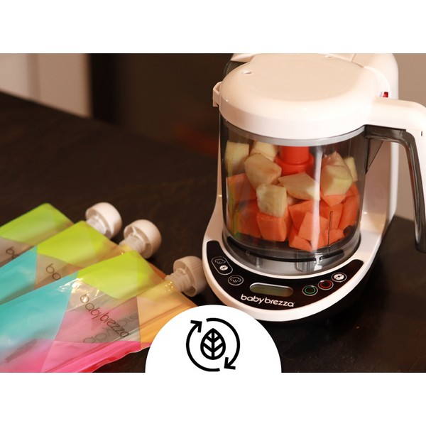 Baby Brezza Food Maker включва 3 торби за многократна употреба за оптимално съхранение на храна и 3 фунии, които ви позволяват да сервирате храна или да напълните 3-те торби.