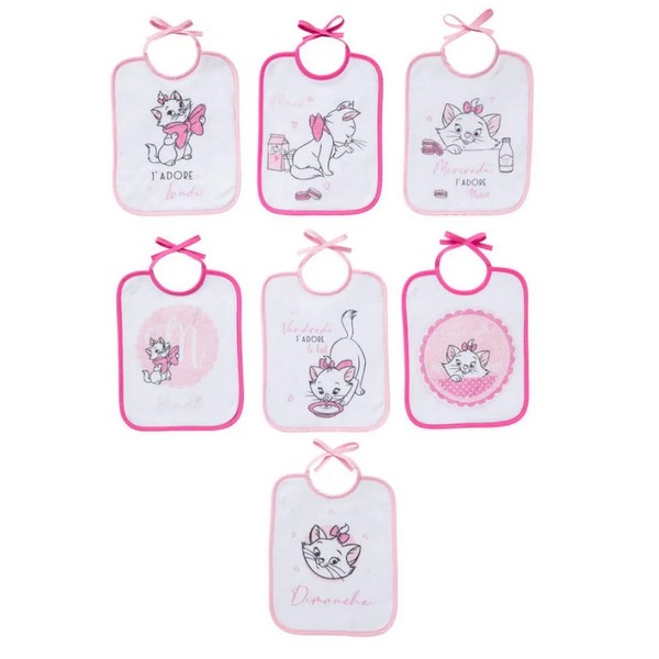 Комплектът включва 7 ежедневни лигавника в розово и бяло, декорирани с деликатни щампи на Мари от Disney. Изработени от мек хавлиен плат, лигавниците осигуряват отлична попиваемост, като предпазват бебешките дрешки от замърсяване по време на хранене.