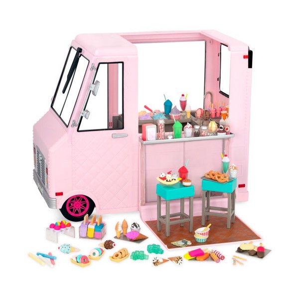 Сладки лакомства на колела. Носете Вкусни изкушения където и да сте. Винаги има време за сладолед. Ново любимо място за вашите кукли от серия Our Generation Dolls. Има три различни песни, които можете да пуснете. Напишете различни промоции на черната дъска или поздравете всички ваши посетители. Голямо разнообрази от 125 бр. различни плодове, ядки, млечни шейкове, храни и др. При дъжд можете да използвате работещите чистачки. Работещите фарове и мигачи позволяват безопасно шофиране. Продукт носител на награди! Мисията на Our Generation е да бъде създадена не кукла само за игра, а такава която вдъхновява момичетата да бъдат такива, каквито искат. Куклите и аксесоари OG са представител на това поколение момичета, които имат различни интереси, но все още растат заедно и са приятели с онези, които имат различни истории за разказване. Действат като модел за подражание. Всяка от куклите има уникална история и индивидуалност! Част от продажбите на тези кукли отива в подкрепа на инициативата „Освободи детската сила на момичетата“. Играта с кукли развива в децата паметта. Чрез тях децата измислят сюжети, разрешават различни проблеми. Те са партньор по игра или най-добра приятелка. Изработени са от безопасни и висококачествени материали.