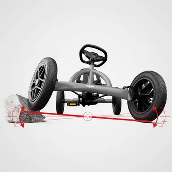 BERG Buddy има отлична стабилност благодарение на четирите си колела и е оборудван с люлееща се ос. Това позволява на предните колела да се движат леко нагоре и надолу, за да смекчат неравностите по пътя.