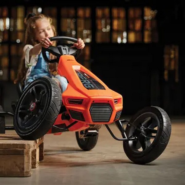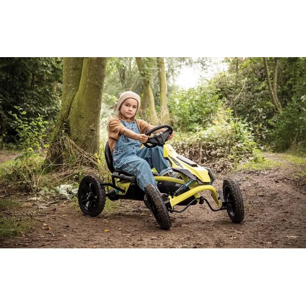 Возете се комфортно с пневматични гуми и люлееща се ос. Карайте бързо напред или назад с BFR. Включва ръчна спирачка за безопасно паркиране. Регулируемата седалка гарантира, че Rally ще расте с вашето дете в продължение на години!