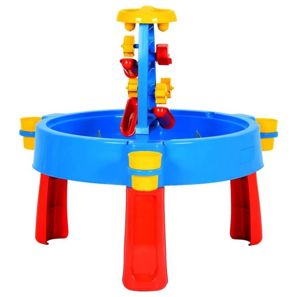 Многофункционална маса с отделения за вода и пясъкВключва аксесоари за игра – фунии, лопатки, въртящи се елементи и канали