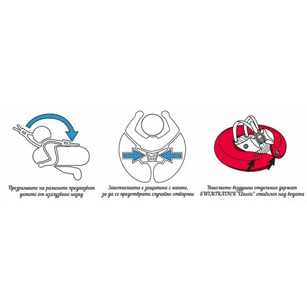Със своите 3 различни обучителни пояса, червен, оранжев и жълт, SWIMTRAINER създава образователна система за плуване за деца от 3 месеца до 8 години. Това е една от най-безопасните системи за обучение по плуване, осигурена от специалния дизайн, регулируемите презрамки, опорната позиция и подходящия размер на продукта според нуждите на детето. В зависимост от тяхната възраст, тегло и умения можете да избирате между 3 вида.
