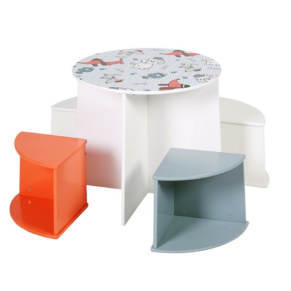 Ginger home DOGS - Детска Дървена Маса, Кръгла с 4 Стабилни Столчета, Комплект с Компактен Дизайн