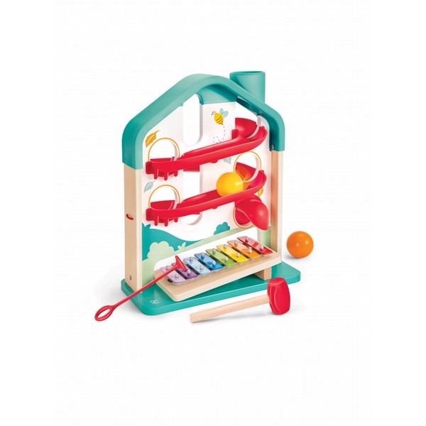 Пъхнете в коминчето цветната топка, а с помоща на малкото чукче помогнете топчето да извърви пътя, когато стигне до края ще чуете красивите мелидии на ксилофона.