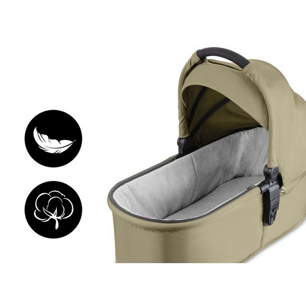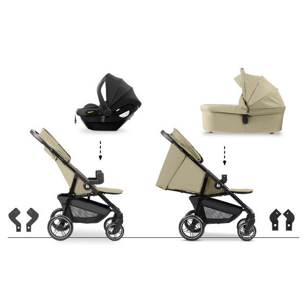 С включените адаптери, кошът и столчето за кола се монтират директно върху шасито на количката. Получавате готова система за пътуване за секунди – бързо и лесно.