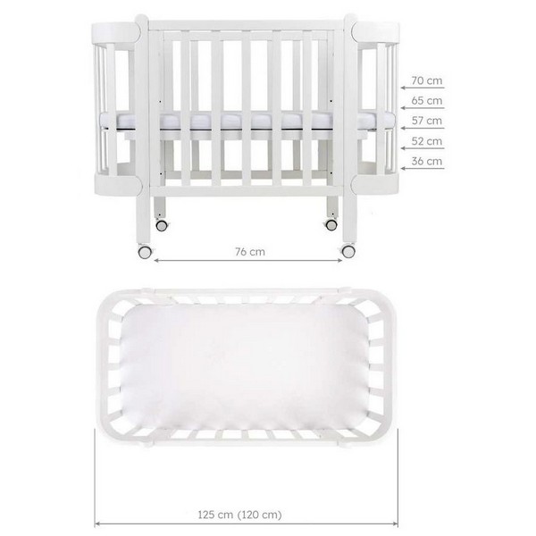 Лежащата повърхност е регулируема по височина и наклон, което позволява безпроблемно сливане с повечето стандартни родителски легла, създавайки обща спална площ.