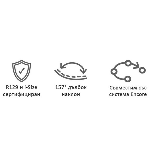 Наклон до почти напълно легнало положение, осигуряващо безопасност и спокойно дишане в колата или в бебешката количка. Трансформира се във въртящо се на 90° столче за кола с i-Base™ Encore (предлага се отделно).