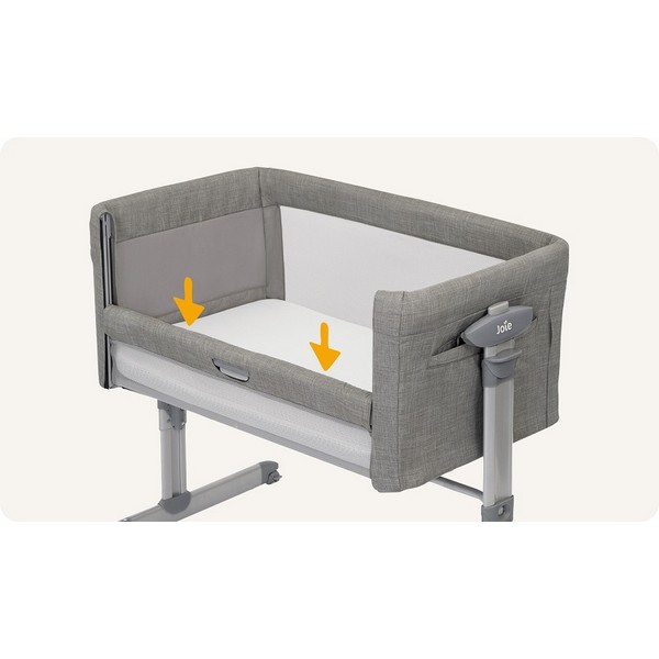 Повдигайте и спускайте плъзгащия се страничен панел само с една ръка за лесен достъп до вашето мъниче... дори на тъмно