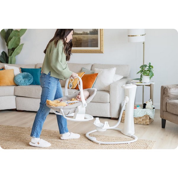 Седалката се отделя, за да стане преносим шезлонг, така че можете да вземете бебето със себе си, докато се движите из дома, без да се налага да пренасяте цялата люлка. Вземете го с вас дори когато сте на почивка, така че бебето да се наслаждава на комфорта на любимата си седалка, когато сте извън дома.