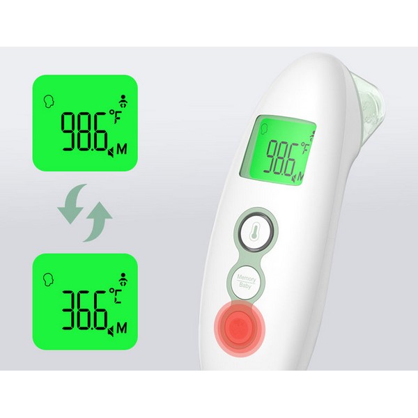 Този термометър от медицински клас позволява измерване както на температурата на челото, така и в ухото, осигурявайки удобство при употреба. Освен това може да измерва температурата на предмети и на околната среда, което го прави изключително универсален. Лесно можете да превключвате между различните режими според нуждите си.