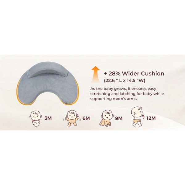 С размери 57.4 × 36.8 см и с 28% по-широка повърхност, възглавницата предлага достатъчно място за растящото бебе. Осигурява комфортно разположение и стабилна опора, като намалява умората дори при продължително кърмене.