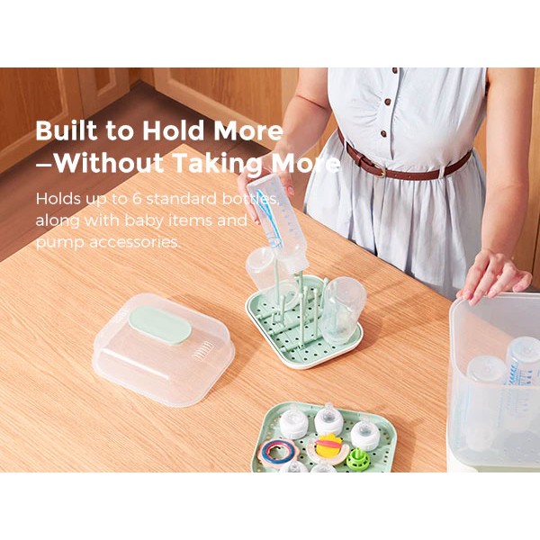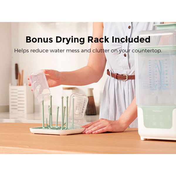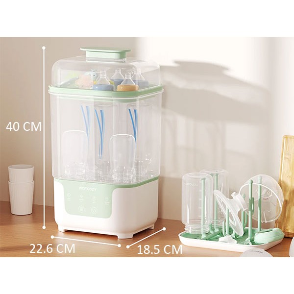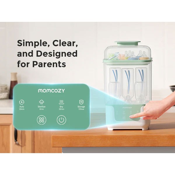 Стерилизаторът Momcozy е с 19% по-компактен от сходни модели, но побира до 6 стандартни шишета, както и аксесоари за новородено като биберони, части за помпа и играчки.