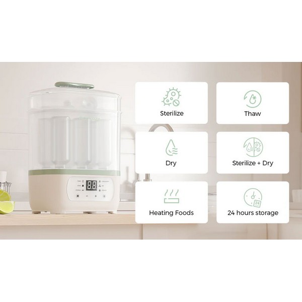 Стерилизаторът на Momcozy е 8-в-1 уред, който ви позволява да стерилизирате, сушите, размразявате и приготвяте бебешка храна. С функция за сигурно съхранение до 24 часа и капацитет за 8 бебешки шишета, той осигурява практично решение за заети родители.