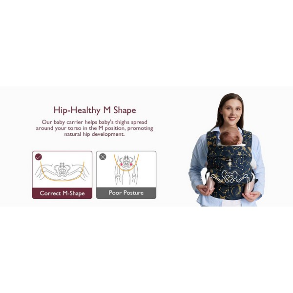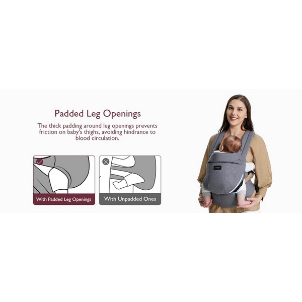 Раницата е проектирана да се използва от 3-месечна възраст до прохождане. Регулируема в три размера, подходяща за деца с тегло от 3,5 до 20,4 кг. Осигурява ергономична позиция „М“ за здравословно развитие на тазобедрените стави и гръбнака, с подплатени отвори за крачетата за по-добра циркулация и комфорт.