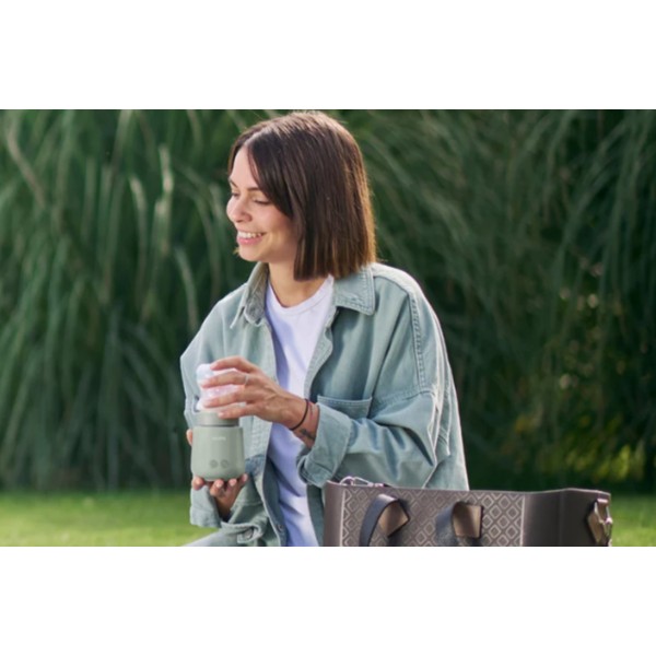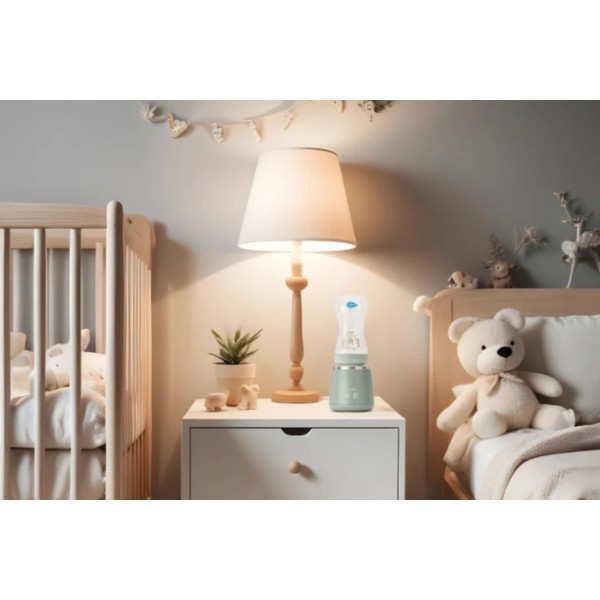 Универсален преносим нагревател за шишета с функция за затопляне и разбъркване. Загрява млякото и разбърква на равни интервали за равномерна температура без студени петна. Бързо затопляне само за 3 минути и задържане на топлината до 4 часа (*120 мл бебешко шише от 20°C до 37°C). 5 температурни настройки: 37°C, 40°C, 45°C, 50°C или 70°C. До 11 бебешки шишета с едно зареждане. Акумулаторна батерия USB (зарядно за батерията е включено). Съвместим с най-продаваните марки бебешки шишета в световен мащаб благодарение на 6-те адаптера, включени в опаковката.
