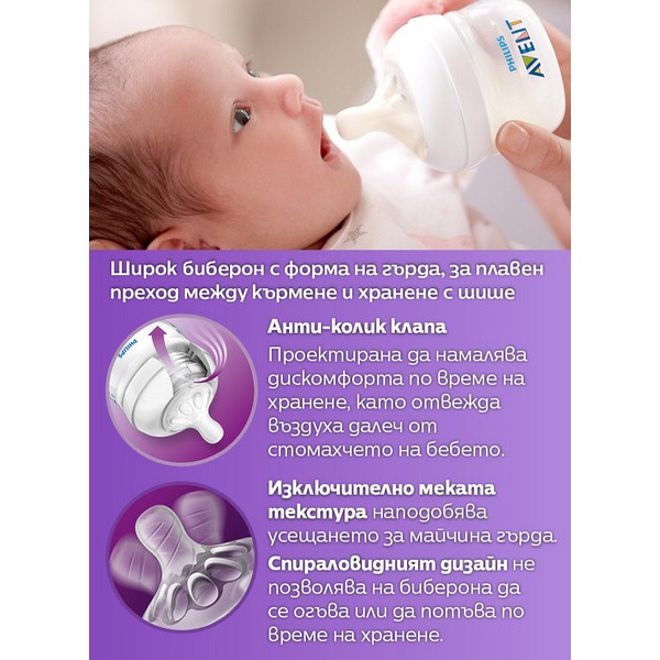 Когато за родителите е важно храненето да остане естествено и плавно, формата на биберона има голямо значение. Широкият биберон Philips Avent Natural наподобява гърдата и подпомага естественото захващане, за да бъде комбинирането на кърмене и хранене с шише по-лесно и по-удобно за бебето.
