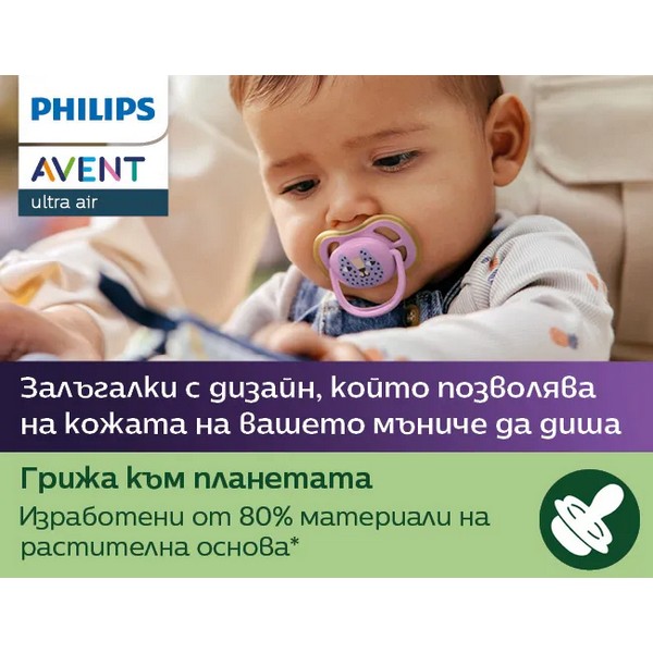 Philips AVENT Ultra Air - 2 броя ортодонтски силиконови залъгалки, 6-18м, с картинки, в кутия за стерилизиране