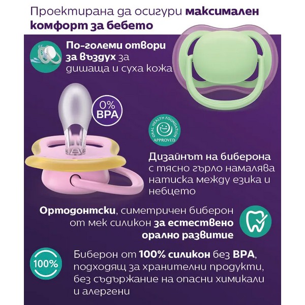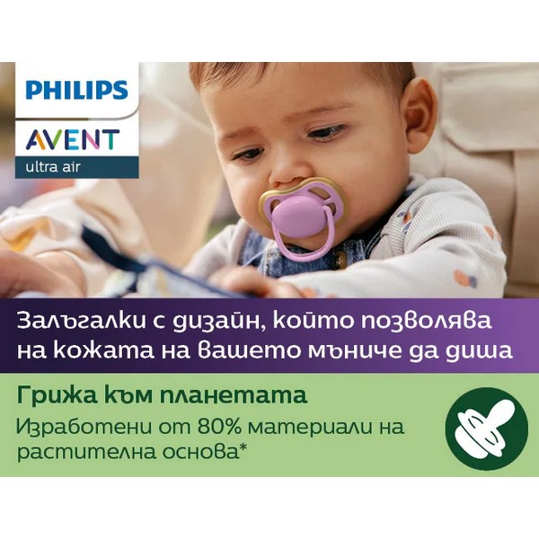 Philips AVENT Ultra Air - 2 броя ортодонтски силиконови залъгалки, 6-18м, едноцветни, в кутия за стерилизиране