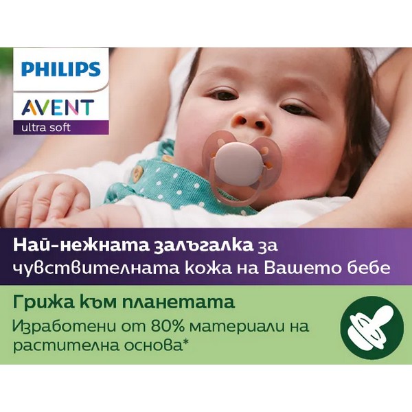 Philips AVENT Ultra Soft - Комплект от 2 броя ортодонтични силиконови залъгалки, в кутия за стерилизиране, plant-based
