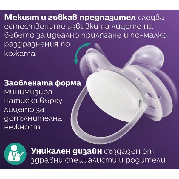 Разработено с експерти: Philips Avent работи в тясно сътрудничество с родители и здравни специалисти, за да разработи уникалния дизайн на залъгалките Philips Avent Ultra Soft