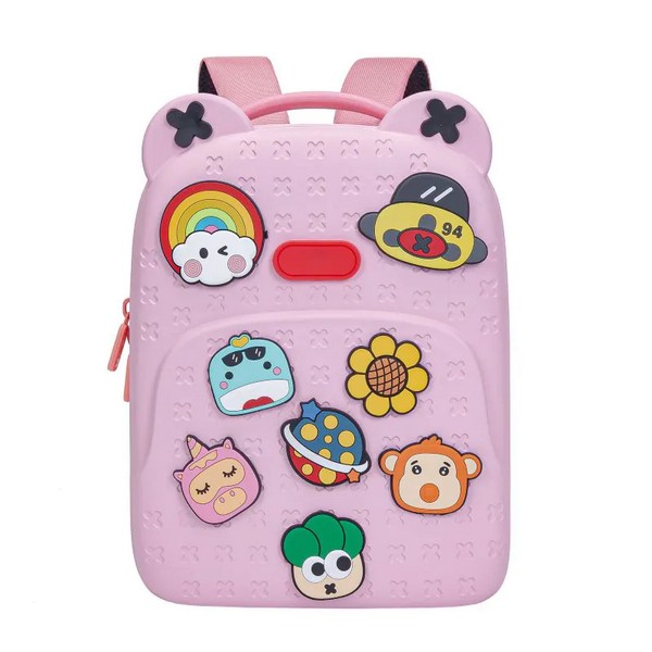 На предния панел има силиконови пинчета с различни картинки, които се поставят в отворите на раницата и могат да се местят в зависимост от желанието на детето.