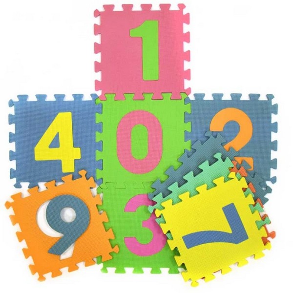 Класически мек детски пъзел-килим с цифри, изработен от EVA пяна. Той се състои от 10 части с цифрите от 0 до 9, които са с размери 29 x 29 см.