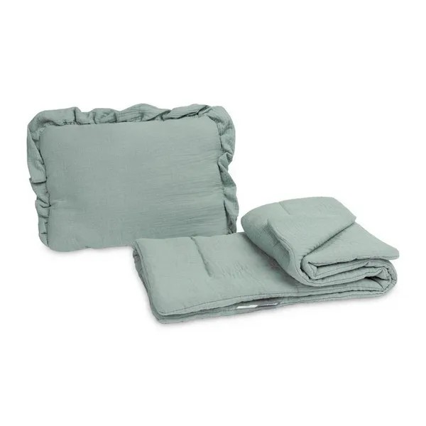 Комплектът включва възглавница и одеяло, изработени от мек и приятен на допир муселин. Този комплект е идеален за употреба в количка, кошара или като мека подложка за бебе. Възглавницата може също да се използва като плюшена играчка. Комплектът съчетава два материала - вътрешният слой е изработен от 100% памук, а външният слой е от мек муселин.