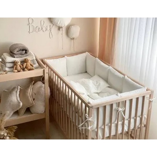 Пликчето за завивка, калъфката за възглавница и чаршафът с ластик са изработени от естествен памучен поплин. Чаршафът с ластик по краищата се адаптира перфектно към формата на матрака в креватчето.