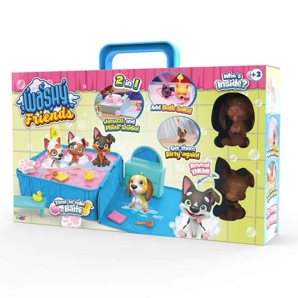 Запознай се с очарователните Washy Friends, супер сладка колекция от кученца, които са си играли в калта! Този страхотен комплект съдържа две кученца, готови за игра! Грижи се за новите си домашни любимци, като използваш наличните аксесоари, за да изкъпеш и разкриеш уникалните им шарки. Кои ще ти се паднат? Време е за баня! Организирай релаксиращ СПА ден за своите кученца с включеното джакузи и аксесоари. А след това можеш да ги нацапаш отново с включената "кал", за да повториш забавлението.