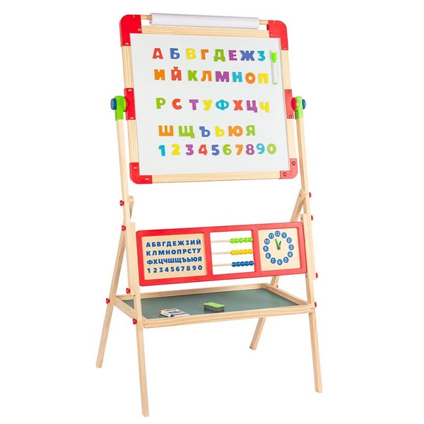 Тази дървена дъска позволява на децата да пишат и рисуват в 3 различни зони. Безпраховите тебешири пишат на черната дъска, а маркерите пишат на бялата дъска.